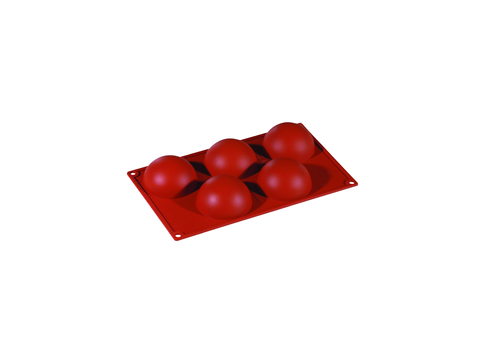 Este molde de silicona Pavoni Formaflex tiene un tamaño total de 175 x 300 mm, con cinco cavidades en forma de semiesfera, cada una con un diámetro de 80 mm y una altura de 40 mm. Cada cavidad tiene una capacidad de 134 ml, lo que proporciona un buen control sobre el tamaño de las porciones. El molde soporta temperaturas de -40°C a +280°C, lo que lo hace adecuado para congelador, refrigerador y horno. El color rojo facilita la identificación del molde en una cocina ocupada.