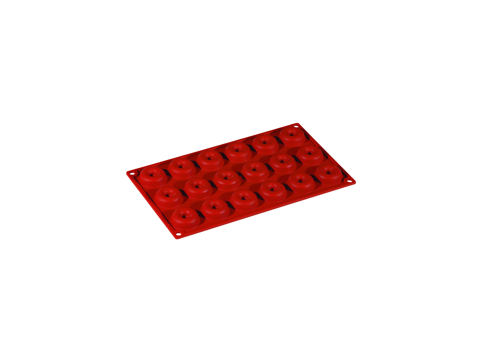 El molde tiene un tamaño de 175 x 300 x 17 mm y contiene 18 cavidades con un diámetro de 41 mm y una altura de 12 mm. Soporta temperaturas de -40°C a +280°C, lo que lo hace apto para horno, congelador y microondas. El material es silicona aprobada para uso alimentario en un llamativo color rojo, que facilita su identificación en una cocina ocupada.