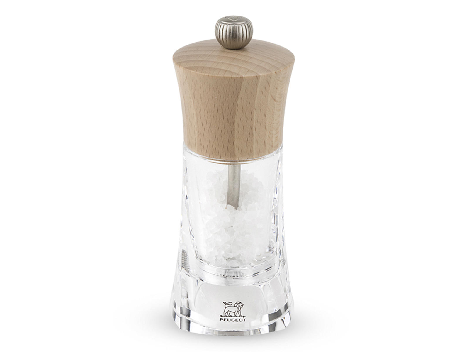 El molino de sal Peugeot Oleron mide 14 cm de altura y pesa 258 gramos. Está fabricado con acrílico de calidad combinado con detalles en madera, lo que le da un aspecto ligero pero sólido. El molino ha sido diseñado específicamente para sal y cuenta con un grado de molienda ajustable, permitiéndote elegir la consistencia que desees. Los materiales han sido seleccionados cuidadosamente para resistir la corrosión provocada por la sal.