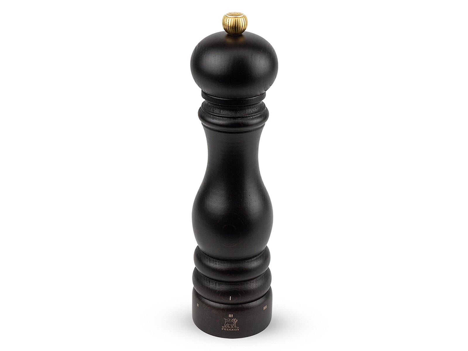 El molinillo de sal mide 22 cm de altura y pesa 370 gramos. Está fabricado en Francia como parte de la clásica serie Paris de Peugeot, que ha estado en producción desde el siglo XIX. El mecanismo de molienda está hecho de Zirconia, un material más duro que el acero y resistente a la humedad y la sal. La superficie está tratada con un hermoso acabado marrón oscuro Chocolate, que resalta la estructura natural de la madera.