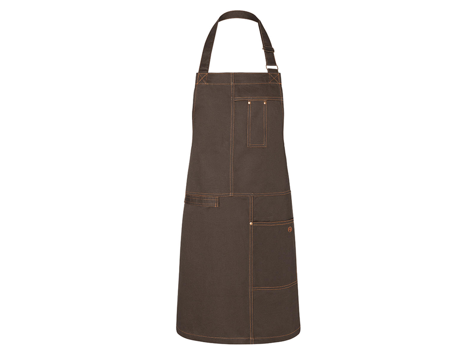 El delantal está equipado con un amplio bolsillo lateral (19x21 cm) que permite un acceso fácil a las herramientas que utilizas con mayor frecuencia. La correa de tela integrada es perfecta para tener un paño de cocina al alcance. El cuello ajustable con hebilla asegura que el delantal se ajuste cómodamente sin importar la complexión, lo cual es especialmente valioso durante largas jornadas laborales. Los remaches en color bronce y las costuras de contraste añaden un toque moderno al diseño clásico.
