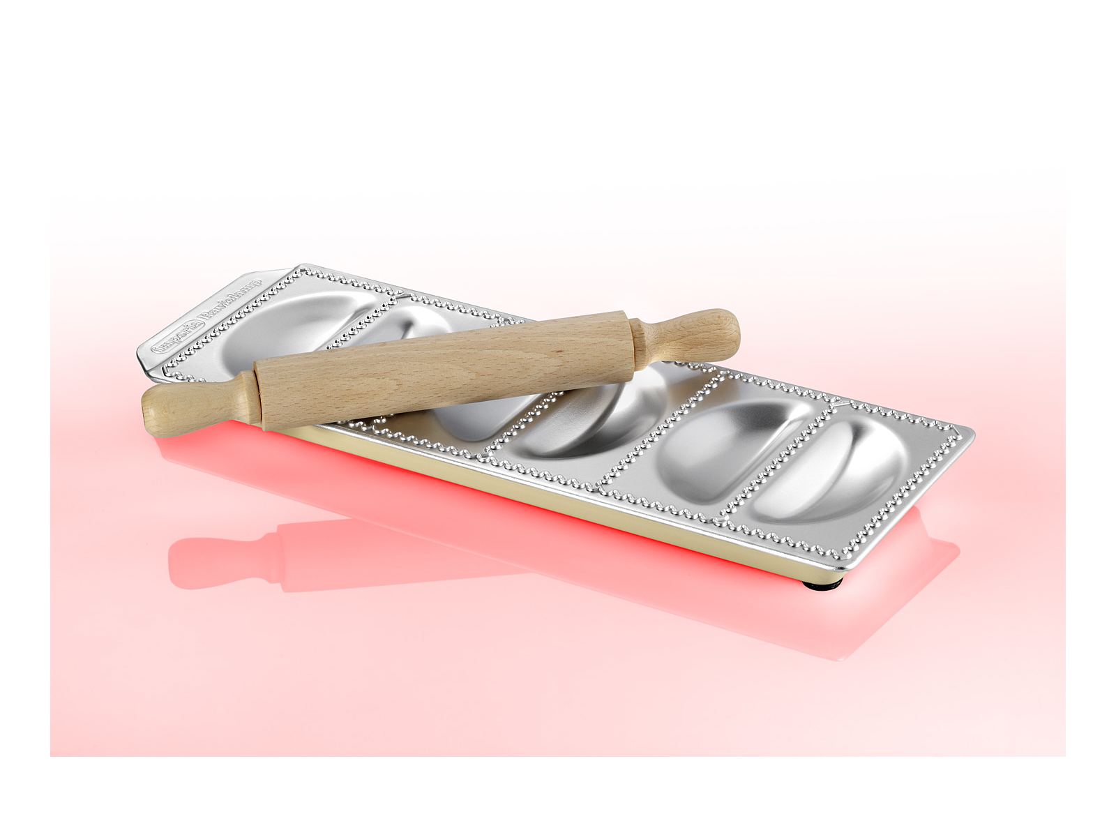 El molde para raviolis tiene unas dimensiones de 19x114x337mm y pesa 290 gramos. La construcción consiste en aluminio para el propio molde y madera de haya para el rodillo, lo que garantiza una larga vida útil con un mantenimiento adecuado. El molde no es apto para lavavajillas y debe limpiarse con cuidado a mano después de su uso.