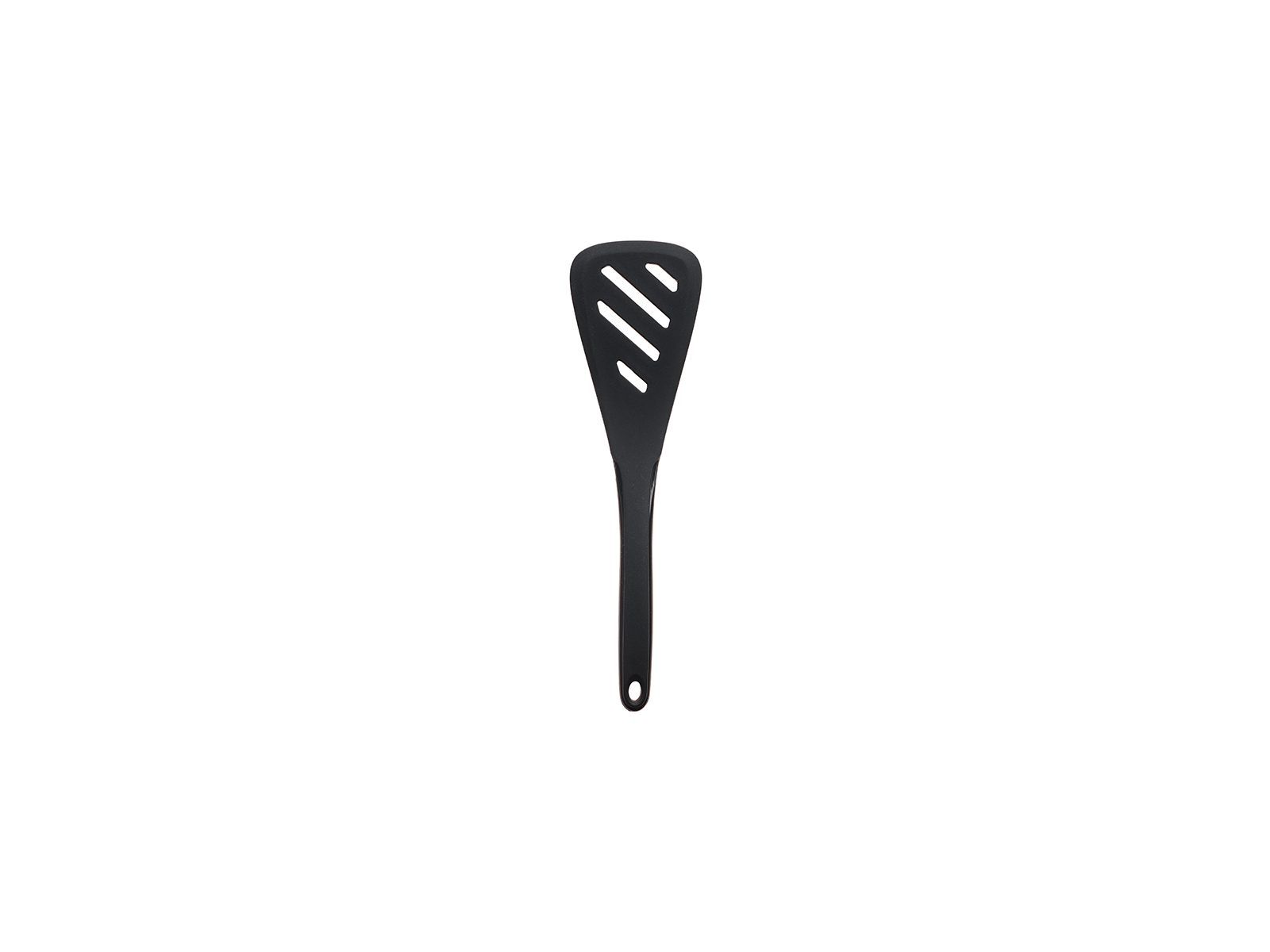 La paleta mide 30 cm de longitud y pesa 112 gramos. Está fabricada de acero inoxidable con un recubrimiento de silicona protectora en color gris antracita. El material es resistente al calor hasta 260°C y puede lavarse en el lavavajillas. Los tres agujeros en la hoja aseguran que el exceso de líquido pueda drenar durante su uso.