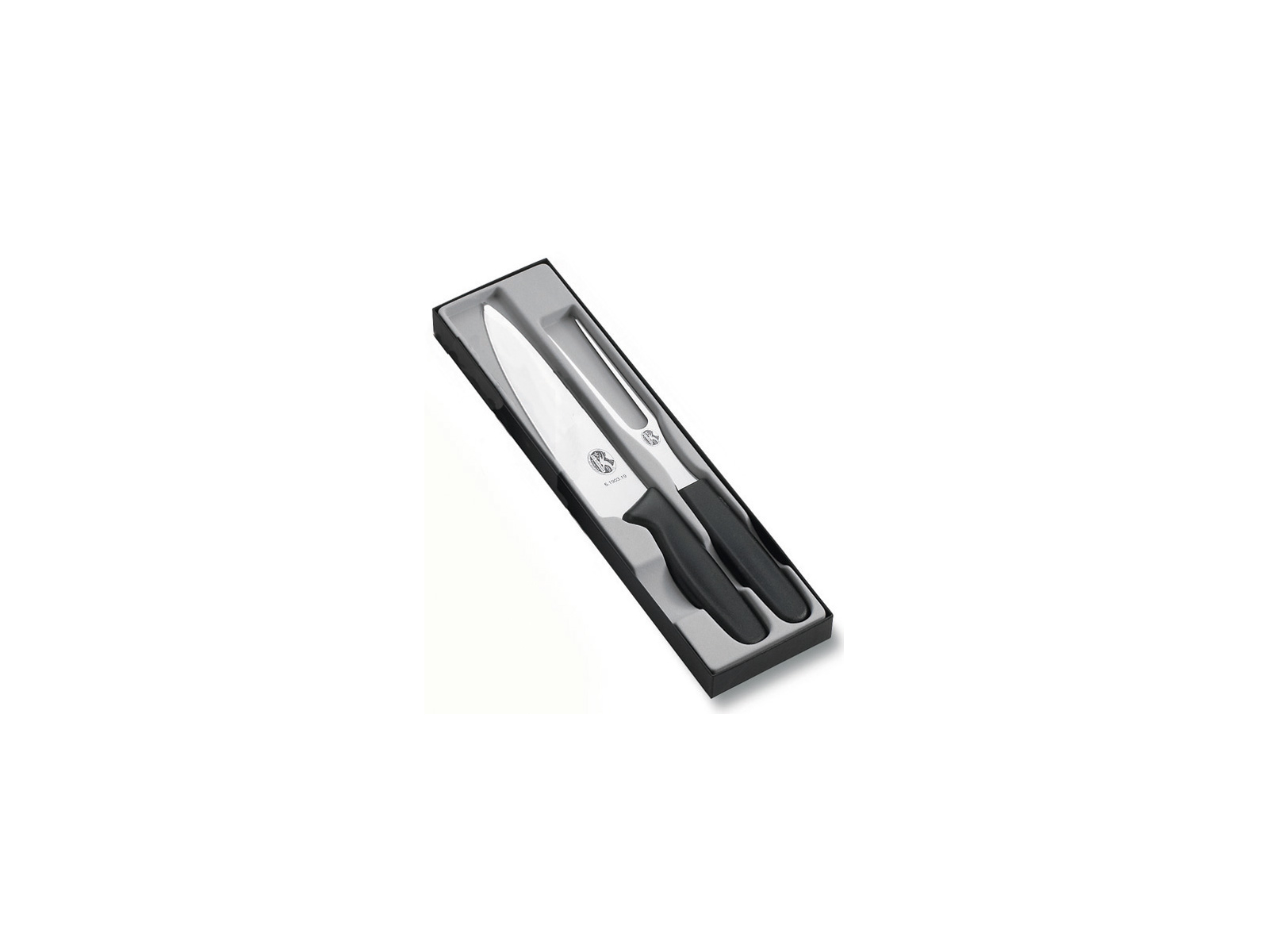 El set de cuchillos Victorinox Swiss Classic incluye un cuchillo de 19 cm para cortar y un tenedor de carne de 15 cm, ambos fabricados en acero inoxidable con mangos de Fibrox. Este profesional set de 2 piezas está diseñado para el corte preciso de carne, donde el cuchillo corta uniformemente a través de las fibras, mientras que el tenedor asegura un manejo estable de la carne durante el trabajo.