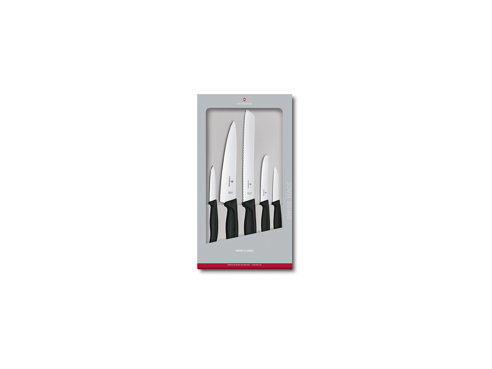 Este juego de cuchillos Victorinox Swiss Classic de 5 piezas te proporciona todo lo que necesitas para tus tareas diarias de cocina. El conjunto incluye cuchillos especializados para diferentes tareas de corte, todos con hojas de acero inoxidable afiladas y mangos ergonómicos de poliamida. El juego está diseñado con un enfoque en la funcionalidad y durabilidad.