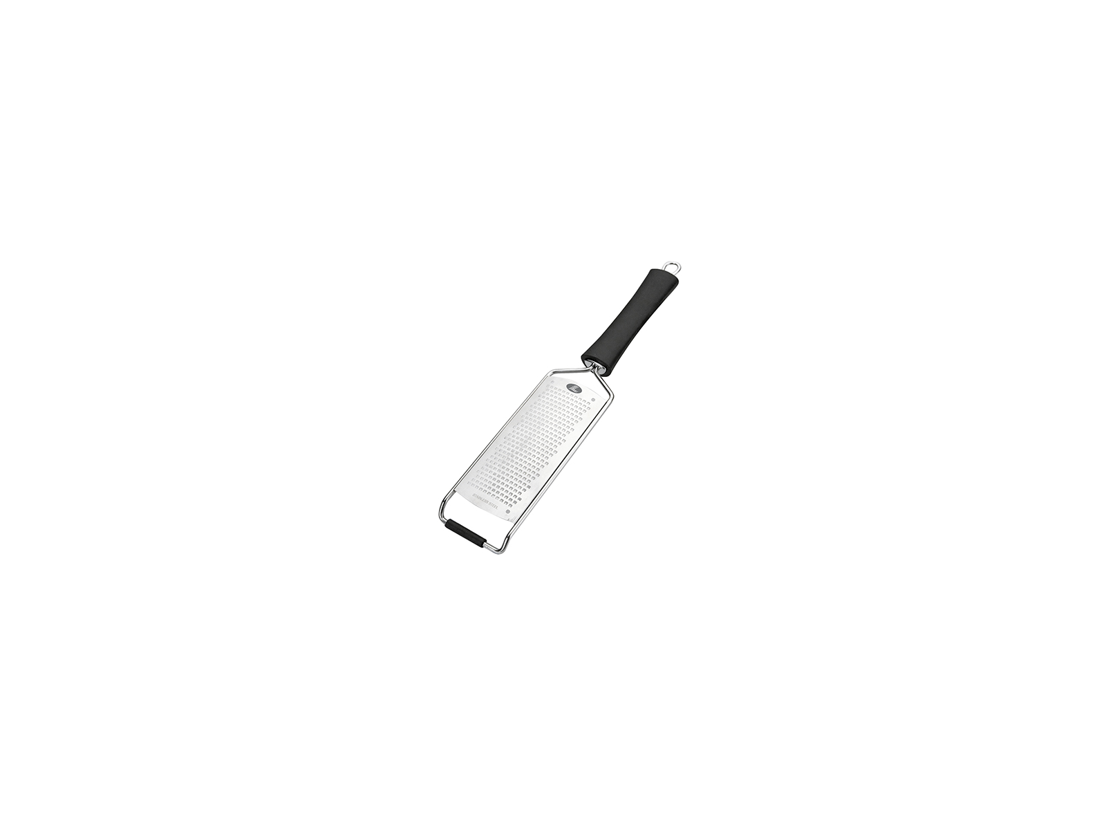 El rallador tiene una longitud de 235 mm y pesa 136 gramos, lo que lo hace fácil de manejar y práctico de almacenar. Está fabricado con acero inoxidable de calidad con un acabado negro que es estéticamente atractivo y práctico. La superficie de rallado extra fina es especialmente adecuada para ingredientes delicados, donde una textura fina es crucial para el resultado final.