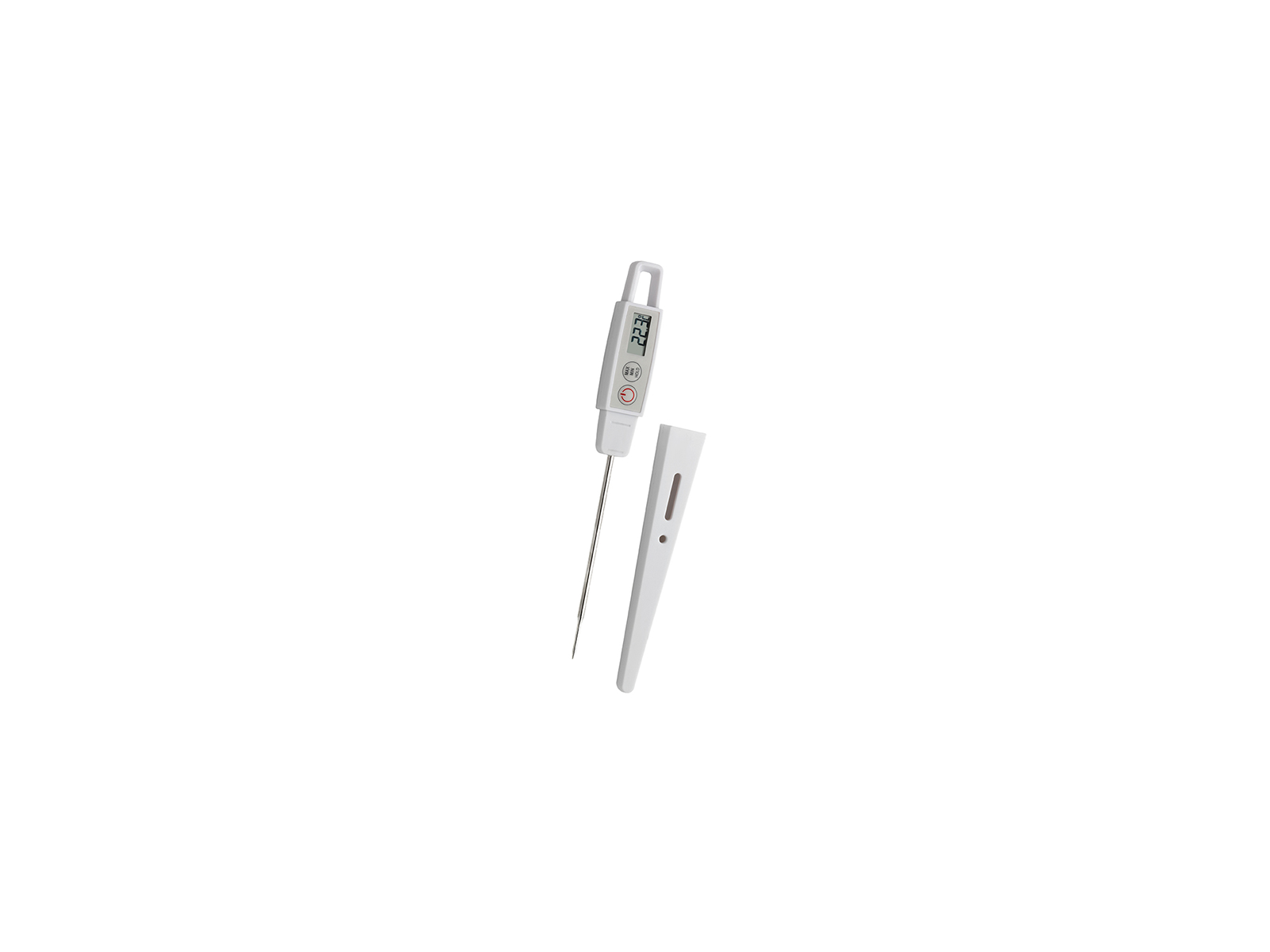Con certificación IP67, el termómetro es completamente resistente al agua y se puede limpiar bajo agua corriente sin preocupaciones. Su diseño compacto (218 x 19 x 24 mm) y su bajo peso de solo 32 gramos lo hacen fácil de llevar. El termómetro viene con una práctica protección de plástico y un clip, lo que permite guardarlo fácilmente en el bolsillo o en el delantal. La batería (1 x LR44 1.5V) está incluida, por lo que puedes comenzar a usar el termómetro de inmediato.