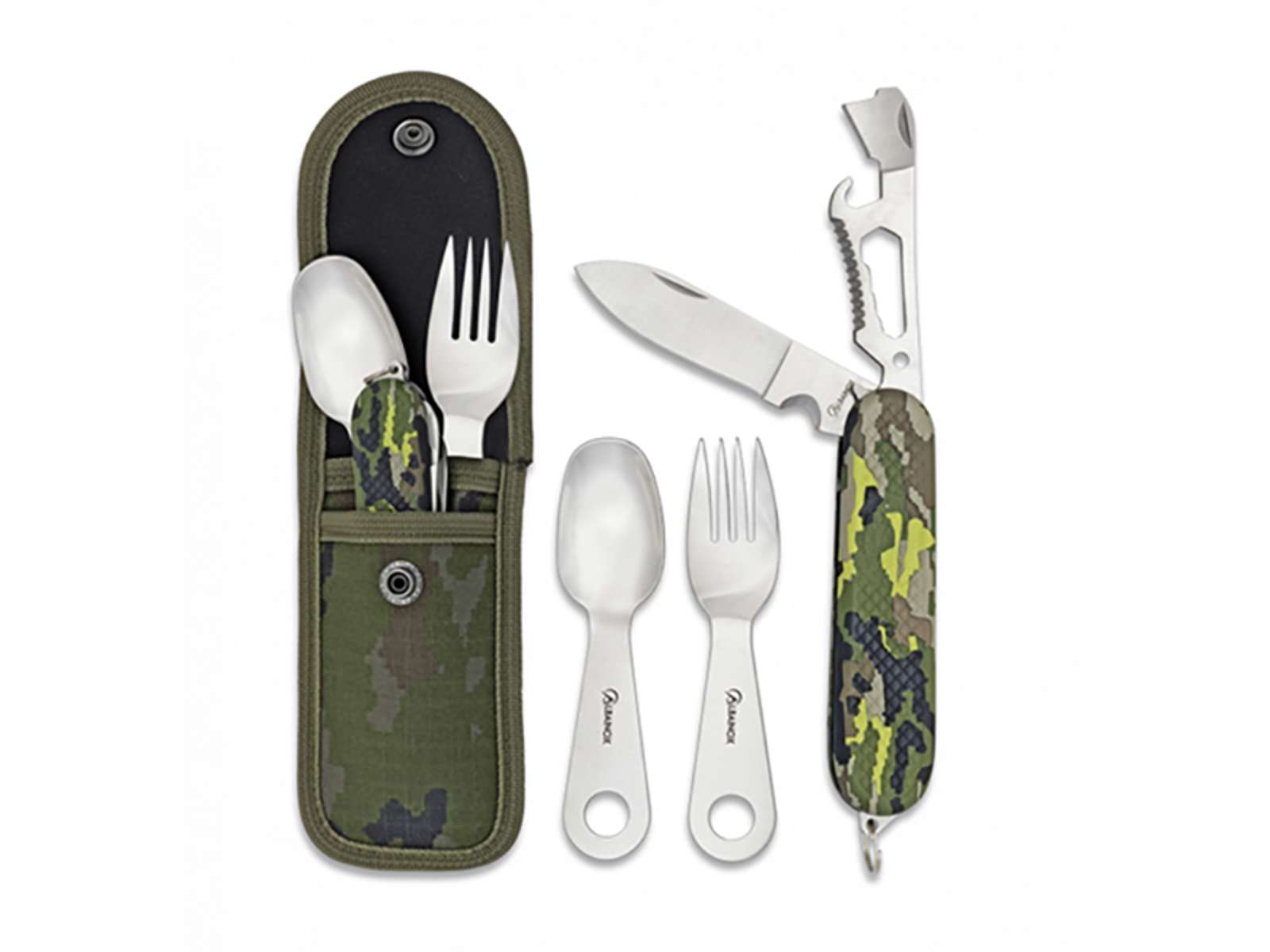 Cuchillo de bolsillo con set de comida de campamento en camuflaje - práctico para uso al aire libre